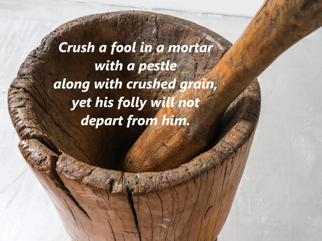 A fool takes no pleasure in understanding but only in expressing his opinion. A fool’s lips walk into a fight, and his mouth invites a beating. A fool’s mouth is his ruin, and his lips are a snare to his soul. Proverbs 18:2,6-7 When words are many, transgression is not lacking, but whoever restrains his lips is prudent. Proverbs 10:19