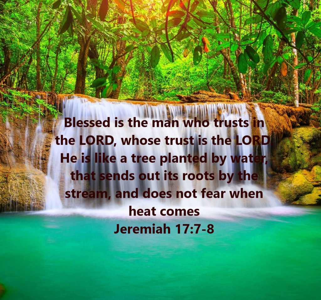 “Blessed is the man who trusts in the Lord, whose trust is the Lord. He is like a tree planted by water that sends out its roots by the stream and does not fear when heat comes, for its leaves remain green, and is not anxious in the year of drought, for it does not cease to bear fruit.” Jeremiah 17:5-8