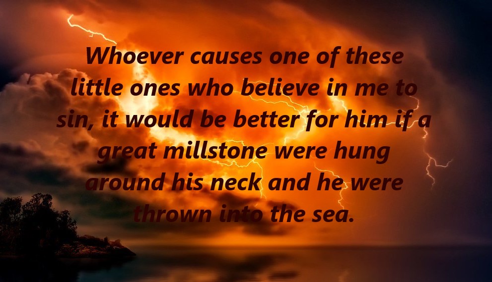 “Whoever causes one of these little ones who believe in me to sin, it would be better for him if a great millstone were hung around his neck and he were thrown into the sea. And if your hand causes you to sin, cut it off. It is better for you to enter life crippled than with two hands to go to hell, to the unquenchable fire. And if your foot causes you to sin, cut it off. It is better for you to enter life lame than with two feet to be thrown into hell.