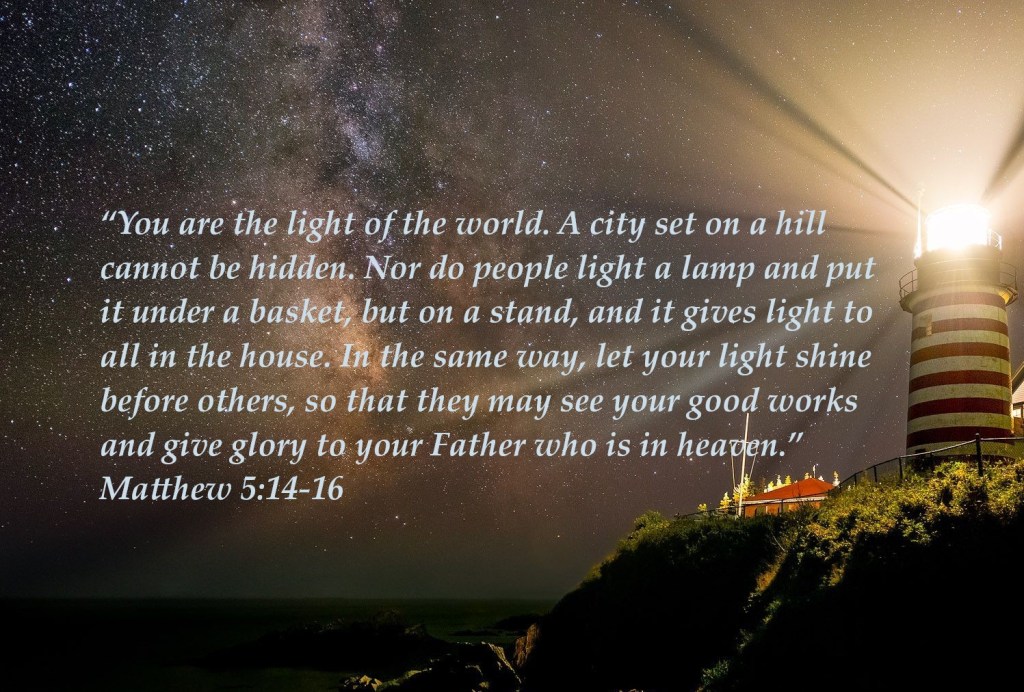 “You are the light of the world. A city set on a hill cannot be hidden. Nor do people light a lamp and put it under a basket, but on a stand, and it gives light to all in the house. In the same way, let your light shine before others so that they may see your good works and give glory to your Father who is in heaven.” Matthew 5:14-16