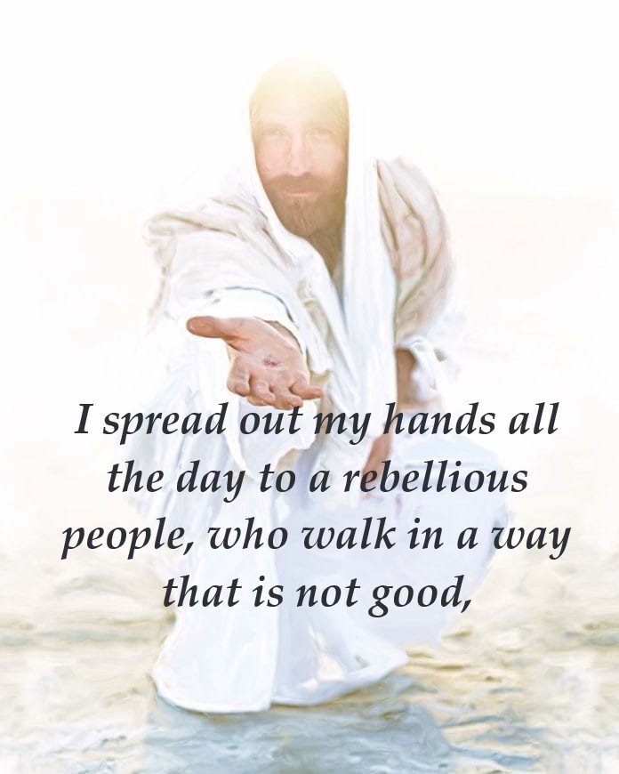 I was ready to be sought by those who did not ask for me; I was ready to be found by those who did not seek me. I said, “Here I am, here I am,” to a nation that was not called by my name. I spread out my hands all the day to a rebellious people, who walk in a way that is not good, following their own devices; Isaiah 65:1-2