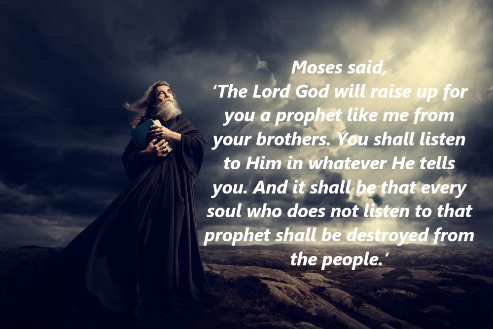 “God spoke by the mouth of His holy prophets long ago. Moses said, ‘The Lord God will raise up for you a prophet like me from your brothers. You shall listen to Him in whatever He tells you. And it shall be that every soul who does not listen to that prophet shall be destroyed from the people.’”