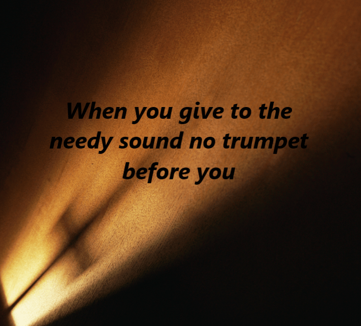 Jesus said, “Thus when you give to the needy, sound no trumpet before you, as the hypocrites do in the synagogues and in the streets, that they may be praised by others. Truly, I say to you, they have received their reward. But when you give to the needy, do not let your left hand know what your right hand is doing so that your giving may be in secret. And your Father who sees in secret will reward you.” Matthew 6:2-4
