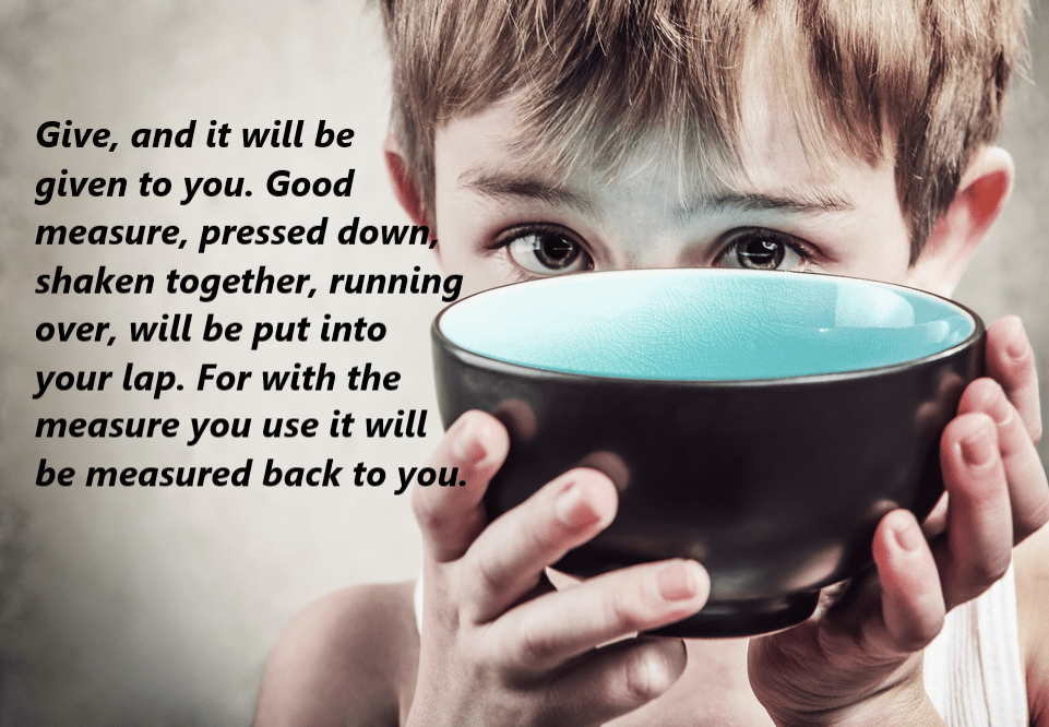 “Give, and it will be given to you. Good measure pressed down, shaken together, running over, will be put into your lap. For with the measure you use, it will be measured back to you.” Luke 6:38