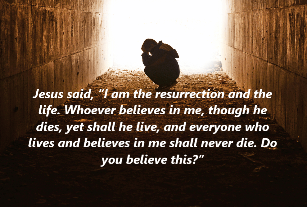 Jesus said to her, “I am the resurrection and the life. Whoever believes in me, though he dies, yet shall he live, and everyone who lives and believes in me shall never die. Do you believe this?” John 11:25-26