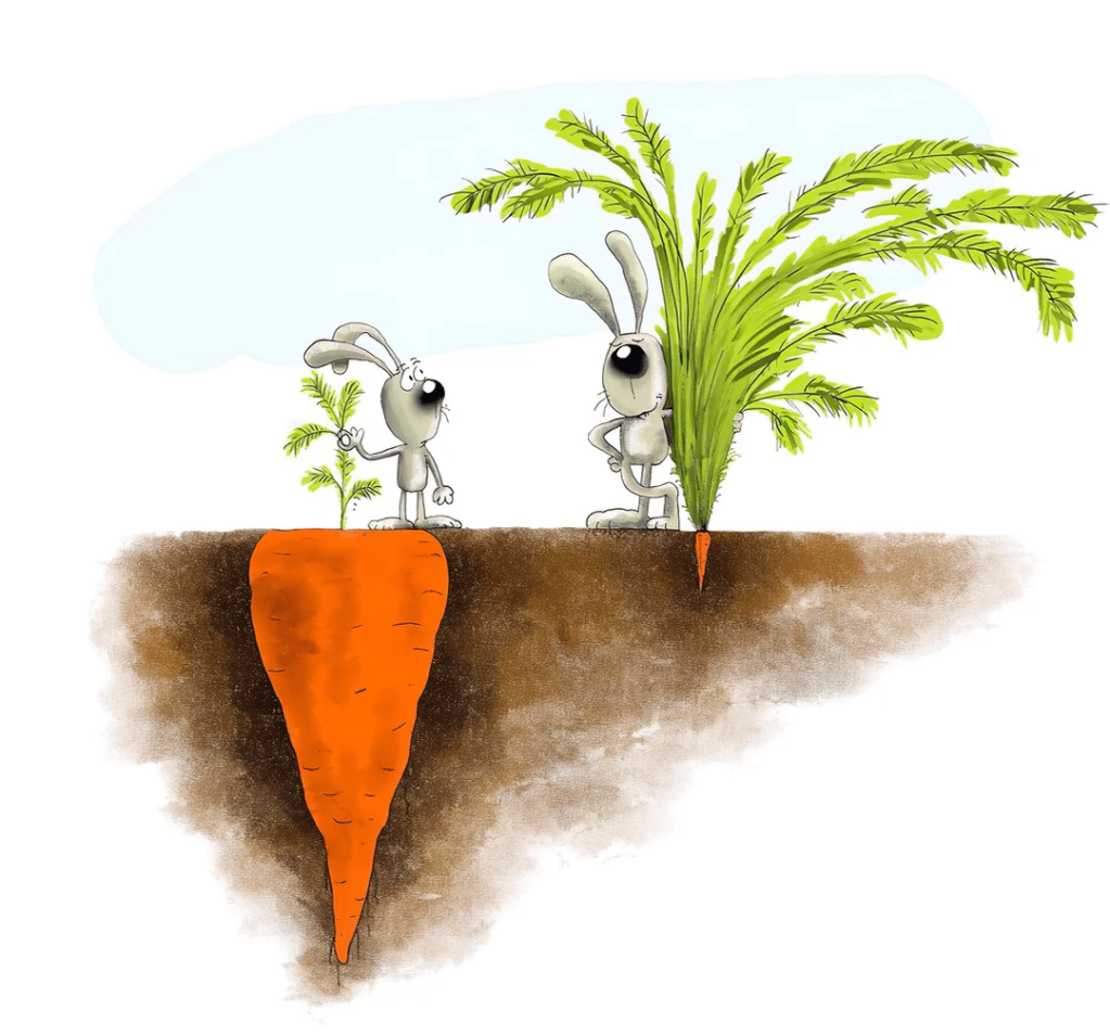 I saw a picture similar to this the other day my wife posted. As you can see, it is of two cartoon rabbits holding onto the tops of their carrots still in the dirt. One stood proud, holding onto the tall, luscious green fronds of a tiny carrot barely hidden beneath the soil. The other stood humble next to an insignificant-looking green leaf but underneath lay an enormous carrot just waiting to be pulled out.